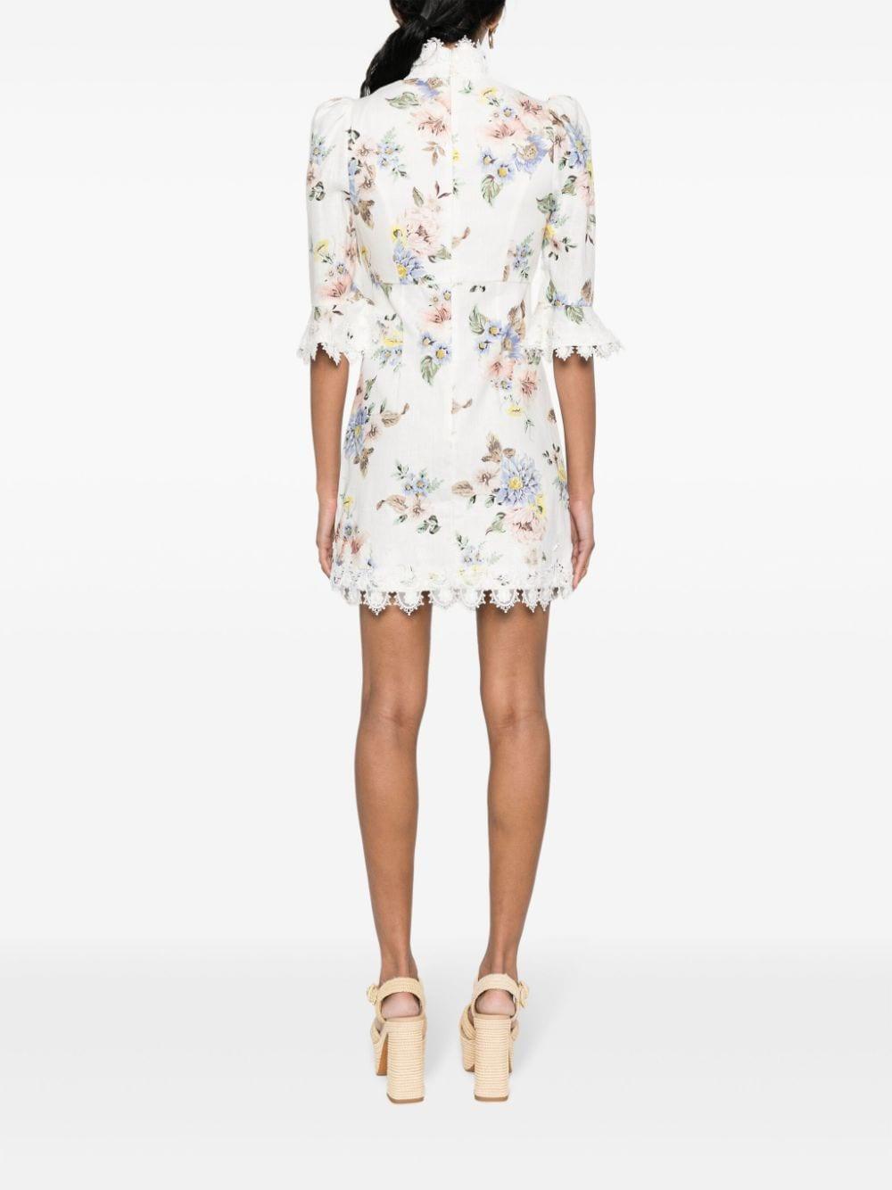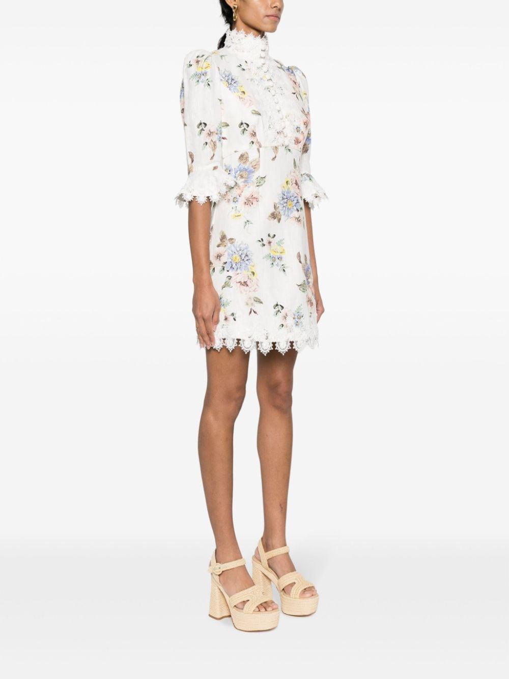 white/multicolour cotton/linen all-over floral print lace trim mock neck front button fastening flounce sleeves A-line skirt scallop hem thigh-length