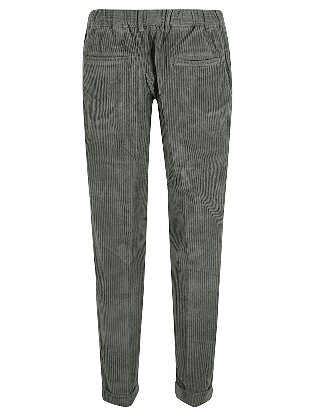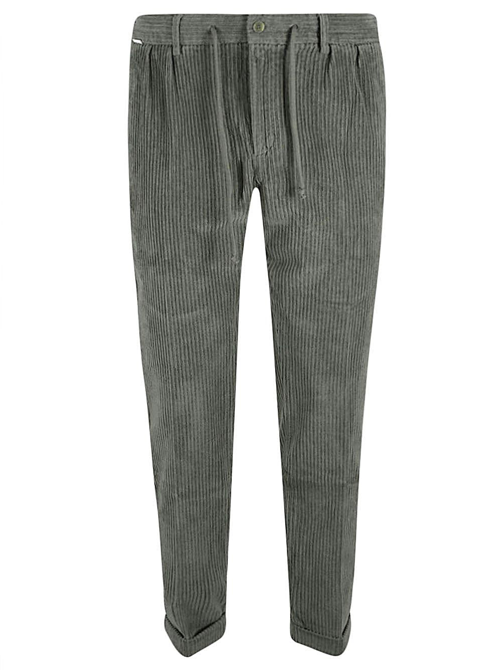 Green trousers, large coast velvet, tapered cut, slim fit, high waist, short cut, double fold, small fabric label, French pockets, zip closure and button, rear fillet pockets, fixed rim rim.