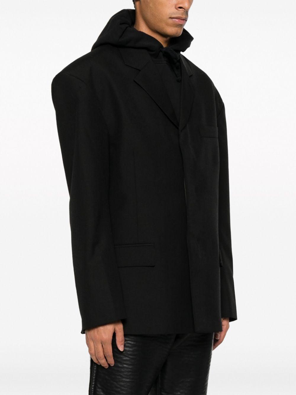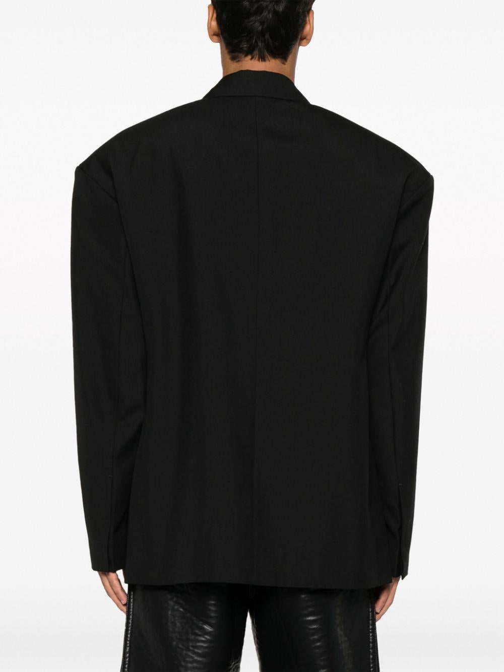 shoulder-pads single-breasted blazer from 032c featuring tonal stitching, shoulder pads, notched lapels, front button fastening, long sleeves, chest welt pocket, two front flap pockets, straight hem and jet black.