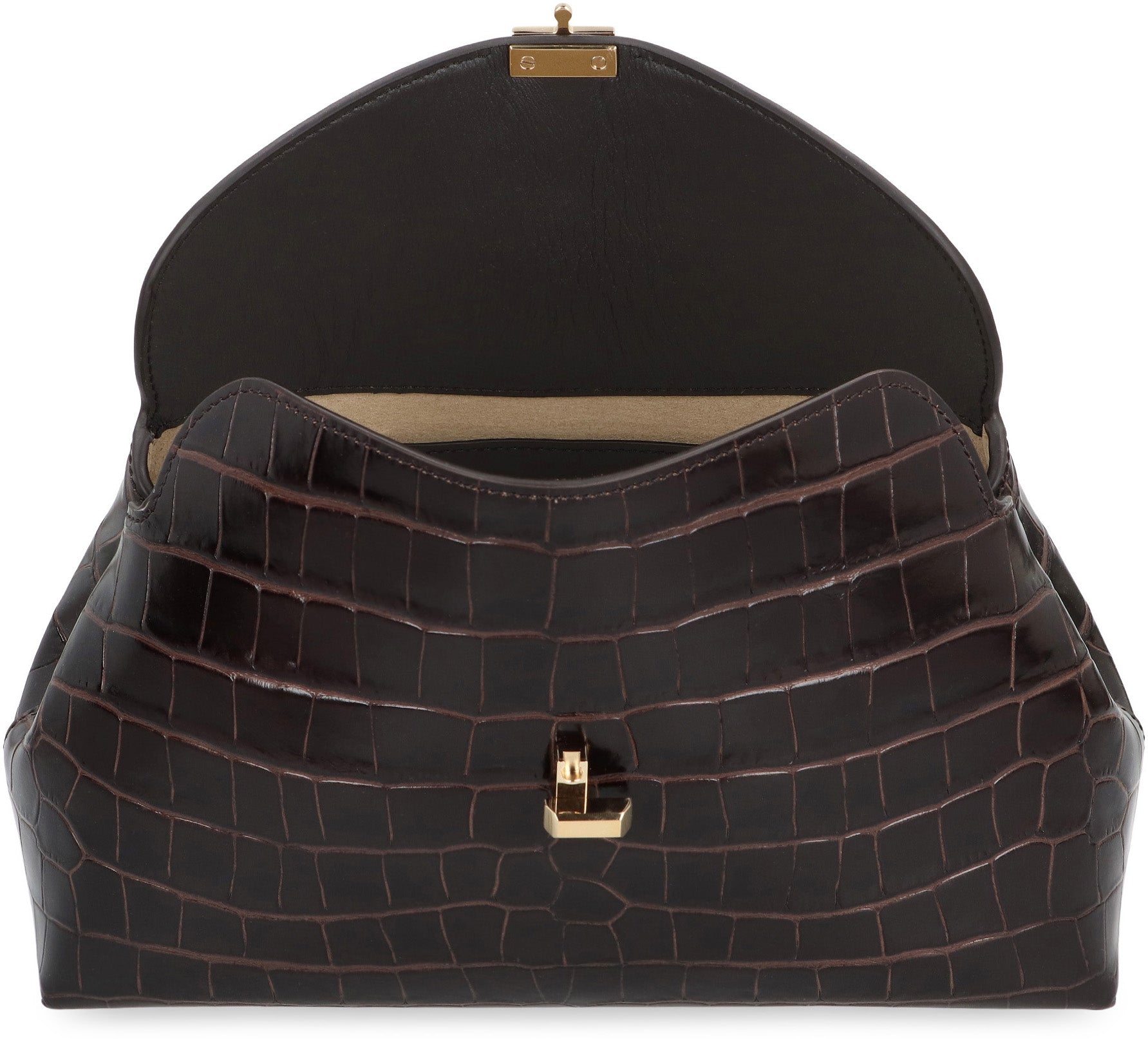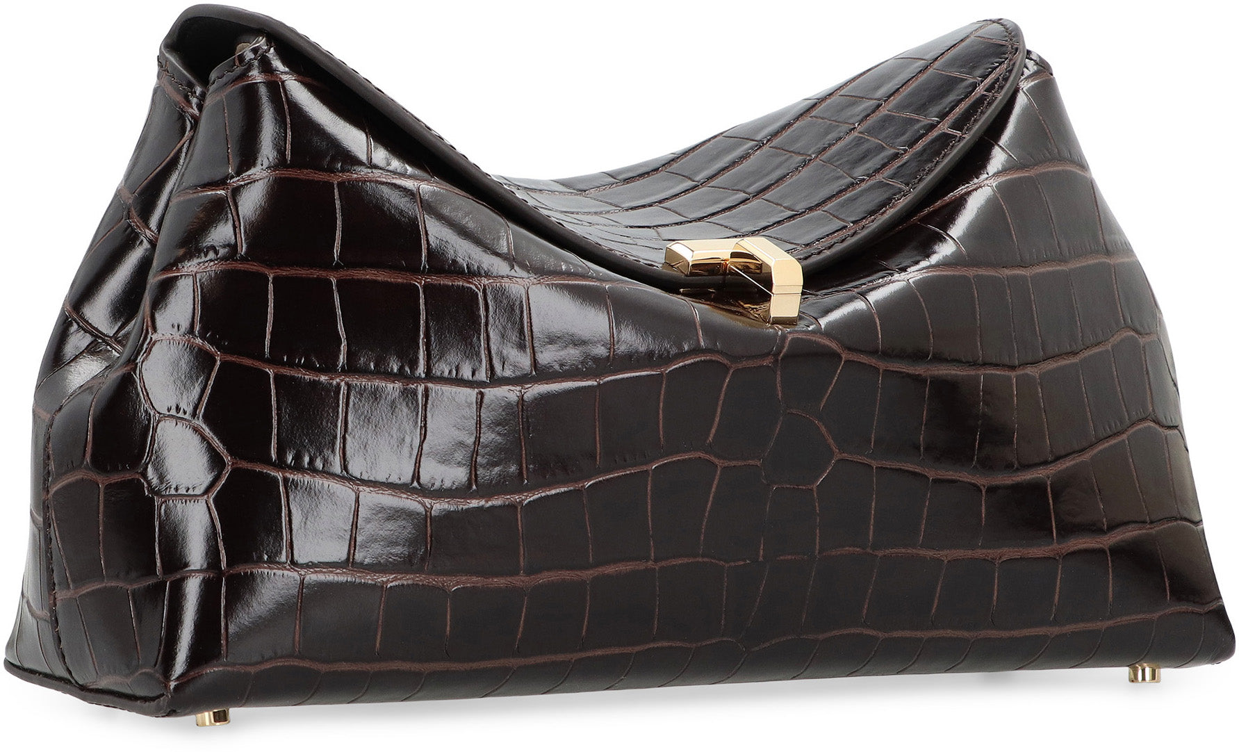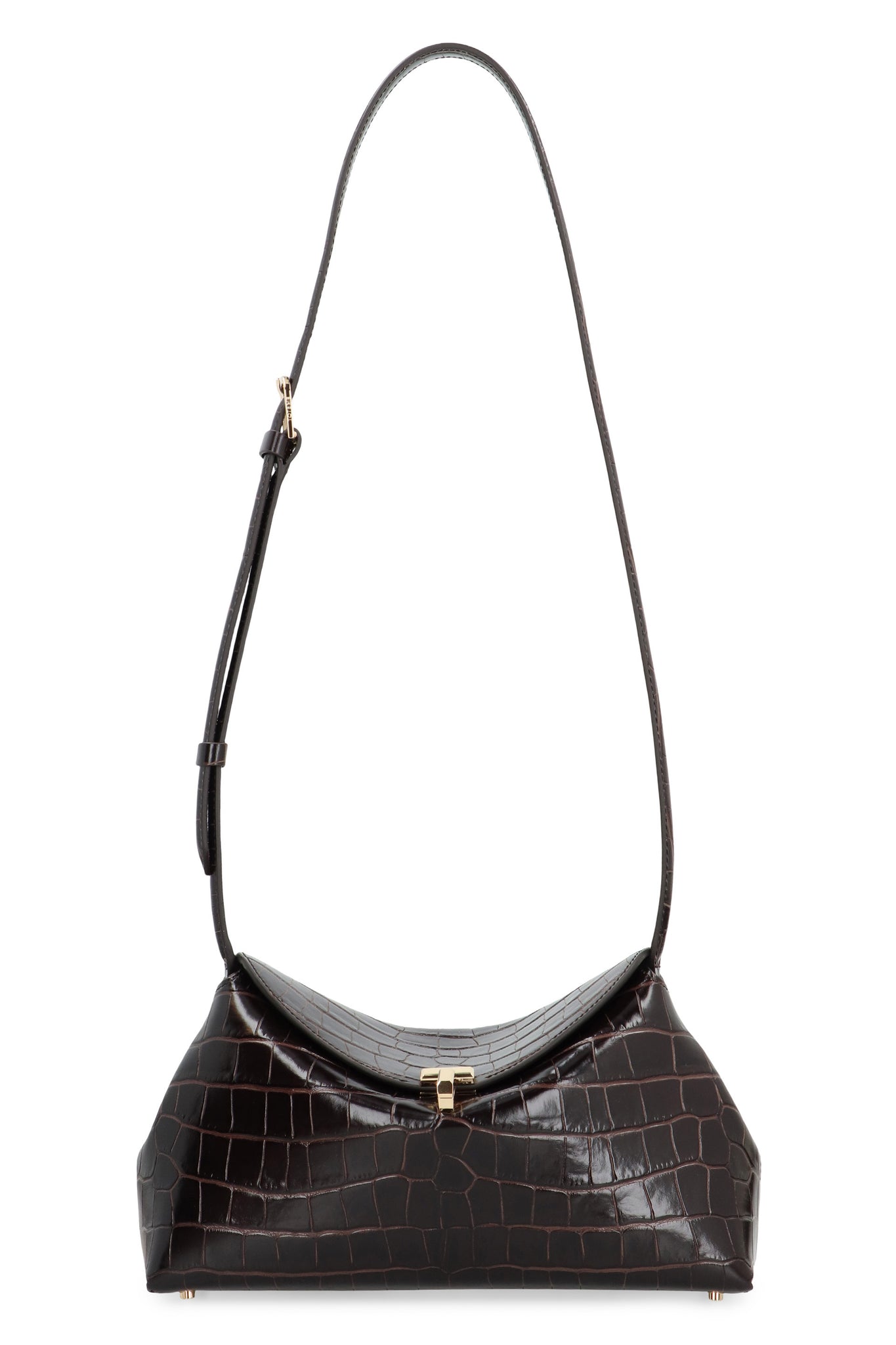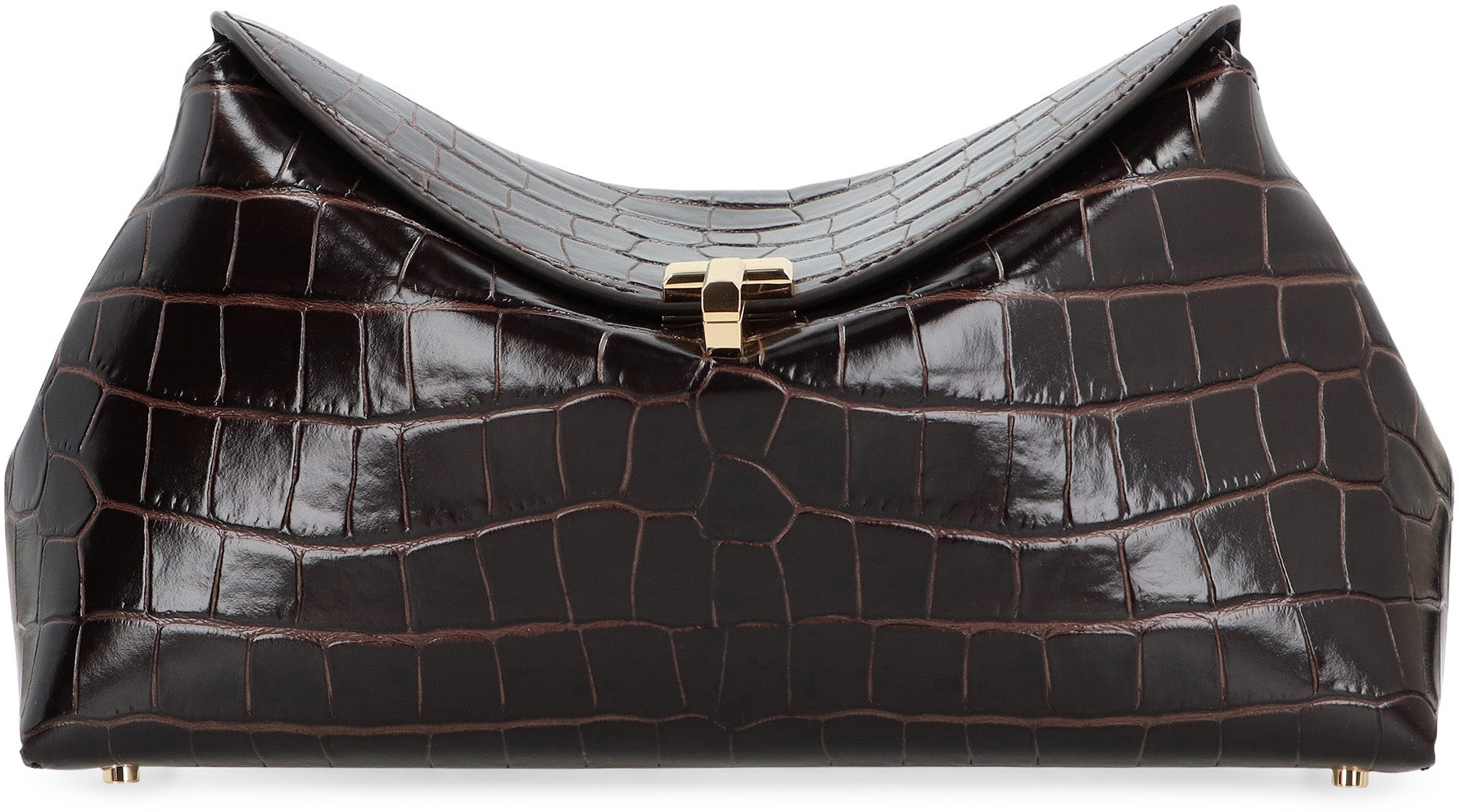 Handheld sculptural bag, called T-lock for the golden metal swivel closure that secures the curved upper flap. It is made of crocodile-effect leather and has an internal compartment for cards. You can carry it by hand or wear it crossbody thanks to the optional shoulder strap. Perfect to pair with different outfits, this bag is an essential accessory for anyone looking for style and functionality.